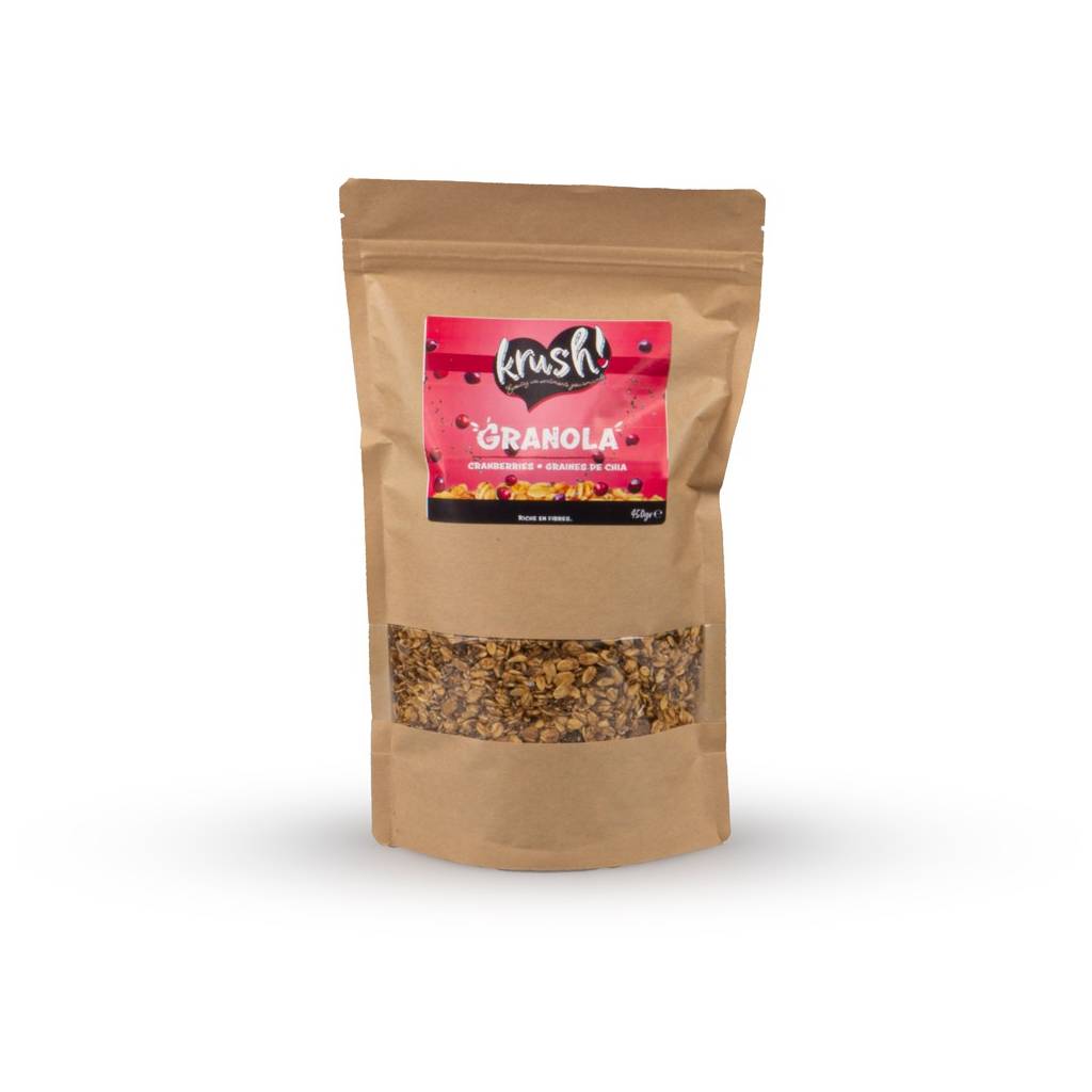 Haferflocken, Rohrohrzucker, Chiasamen (5%), Preiselbeeren (5%), Buchweizenflocken, Agavendicksaft, Rapsöl, Leinsamen, Zimt, Salz.