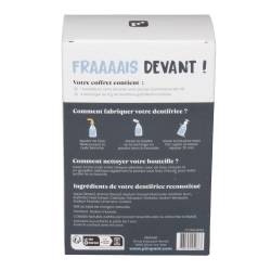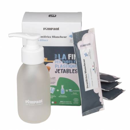Dank einer Nachfüllung von 8 g Pulver zum Verdünnen rekonstituieren Sie 80 ml Zahnpasta (entspricht einer Tube klassischer Zahnpasta). Es hat eine Geltextur wie eine klassische Zahnpasta. Die Zahnpasta enthält einen Wirkstoff, der den Zahnschmelz remineralisiert und aufhellt. Darüber hinaus sorgt es mit seinem natürlichen Minzaroma für einen frischen Atem. Diese Zahnpasta kann für Kinder ab 7 Jahren verwendet werden.