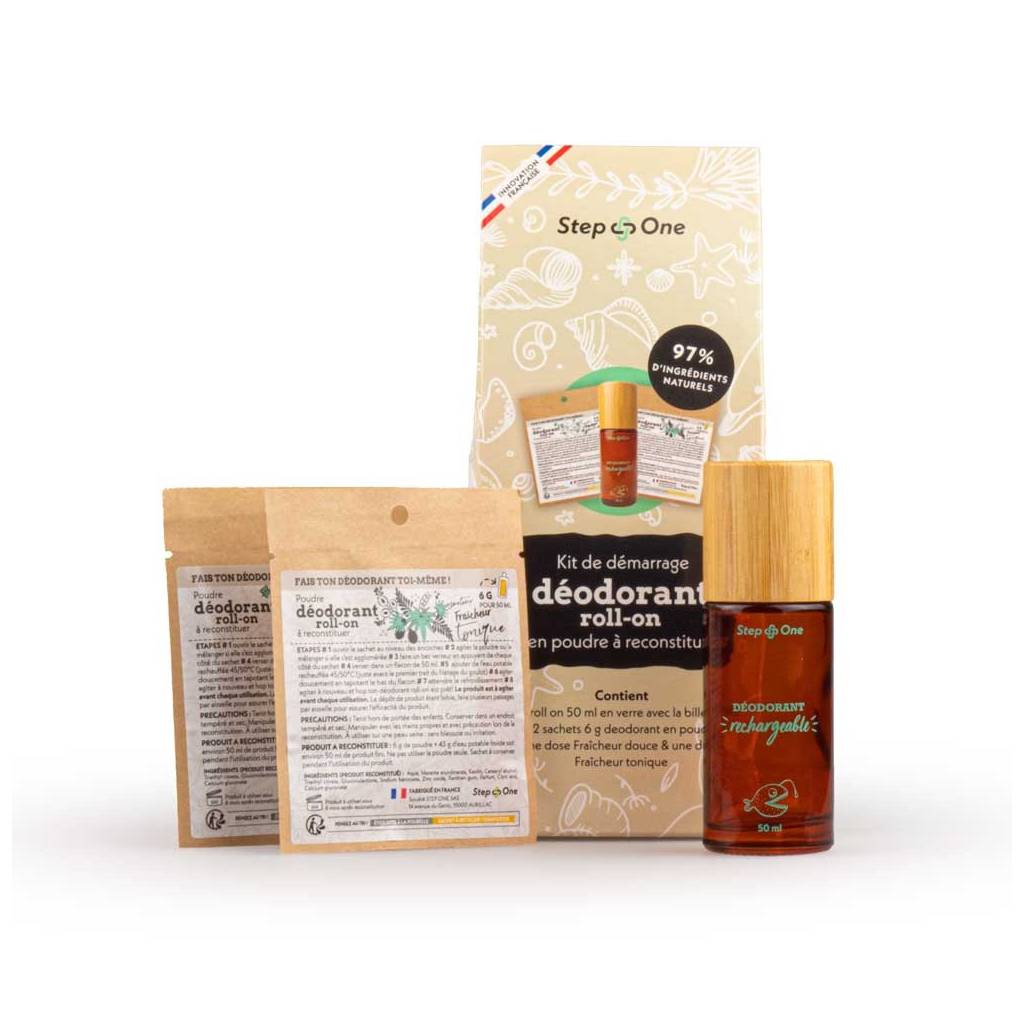 This roll-on deodorant kit comes with a stick with a glass ball and a pretty refillable bamboo cap with sachets of powder to be reconstituted. This box contains two different scents: a "Sweet Freshness" scented sachet with a Neroli base and a "Tonic Freshness" scented sachet with a Green Tea and Flowers base.