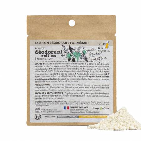 6gr of powder + fill the bottle with water = 50ml of ready-to-use deodorant.