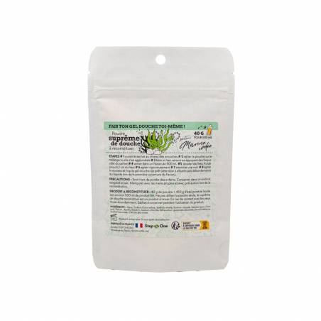 Ce sachet contient 40gr de gel douche sous forme de poudre à mélanger avec de l'eau dans votre flacon de 500ml pour fabriquer vous-même votre gel douche.