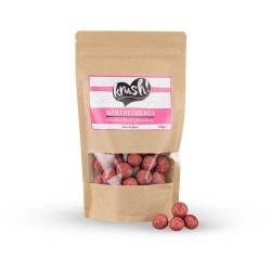 Val voor deze heerlijke geroosterde hazelnoten omhuld met witte chocolade en frambozenpoeder.