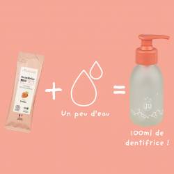Dankzij deze navulling van 8 gram poeder om te verdunnen, kun je 80 ml tandpasta reconstitueren (wat overeenkomt met een tube klassieke tandpasta). Het heeft een schuimende geltextuur en een vleugje fluoride om het ontstaan van gaatjes te vertragen.