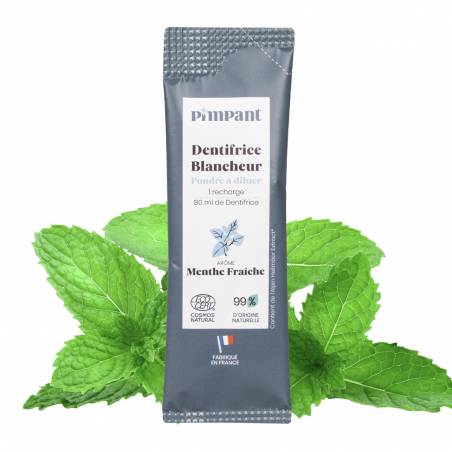 Dankzij deze navulling van 8 gram poeder om te verdunnen, kun je 80 ml tandpasta reconstitueren (wat overeenkomt met een tube klassieke tandpasta). Het heeft een geltextuur zoals een klassieke tandpasta. De tandpasta bevat een middel dat het glazuur van uw tanden remineraliseert en witter maakt. Bovendien zorgt het dankzij het natuurlijke muntaroma voor een frisse adem. Deze tandpasta kan worden gebruikt voor kinderen vanaf 7 jaar.