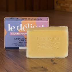 Deze zeep is eco-ontworpen, dat wil zeggen respectvol voor de planeet vanuit elk gezichtspunt: alle ingrediënten komen uit een straal van 800 km van de Lamazuna-kantoren, ze zijn allemaal veganistisch en de koude verzepingstechniek om deze zeep hoeft niet verwarmd te worden.