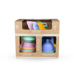 Een doos met 3 speeltjes voor de allerkleinsten vanaf 6 maanden in gerecycled plastic.