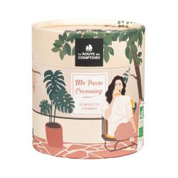 Mijn cocooningbreak is een doos met 20 theezakjes in piramideformaat, samengesteld uit een assortiment van 4 theesoorten en kruidenthee met geruststellende smaken voor deze winter. Het is een perfect cadeau voor alle theeliefhebbers. Deze mooie kartonnen doos bevat: 5 zakjes escape groene thee (munt, mango, citroen), 5 zakjes rooibos cocooning (abrikoos, vanille), 5 zakjes >ontspanning/antistress Ayurvedische infusie (tulsi, zoethout, eschscholzia) en 5 zakjes kruidenthee met perzik- en abrikozensmaak.